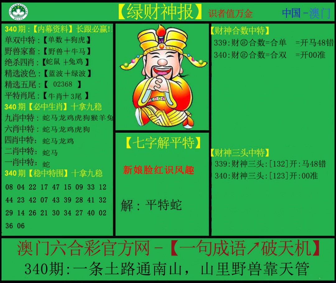 340期: 澳门六合宝典彩圖信封【绿财神报】每期自动更新