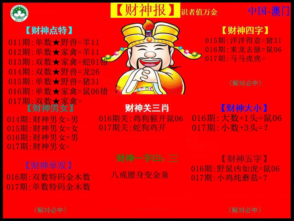 017期: 澳门六合宝典彩圖信封【黄财神报】每期自动更新